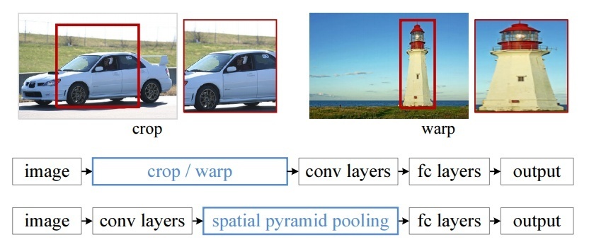 ss算法的区域建议框同样在原图上生成,但是却在Conv5上提取,当然由于尺寸的变化,在Conv5层上提取时要经过尺度变换,这是它R-CNN最大的不同,也是SPP-Net能够大幅缩短时长的原因。因为它充分利用了卷积计算,也就是每张图片只卷积一次,但是这种改进带来了一个新的问题,由于ss算法生成的推荐框尺度是不一致的,所以在cov5上提取到的特征尺度也是不一致的,这样是没有办法做全尺寸卷积的(Alexnet)。