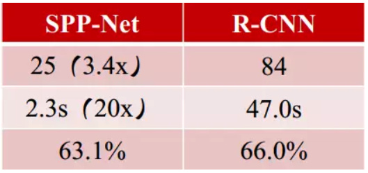 上面这张图说明了下SPP-Net与R-CNN的性能对比,其中训练时间SPP-Net需要25个小时,而R-CNN需要84小时;单张图片的测试时间SPP-Net只需要2.3s,而R-NN需要47s,这就是共享卷积计算带来的速度上的提升,也是SPP-Net最重要的贡献;最后一个指标,SPP-Net的mAP相比R-CNN反而更低了,这是因为SPP-Net的结构无法fintune卷积层。